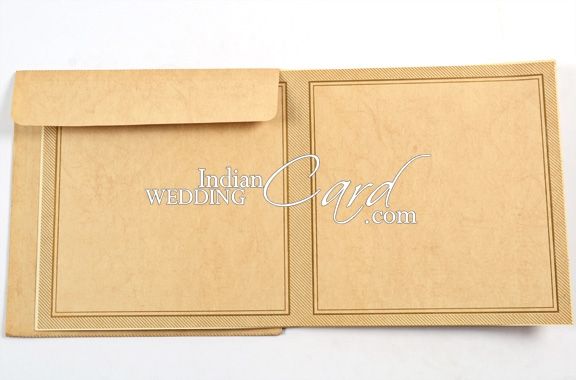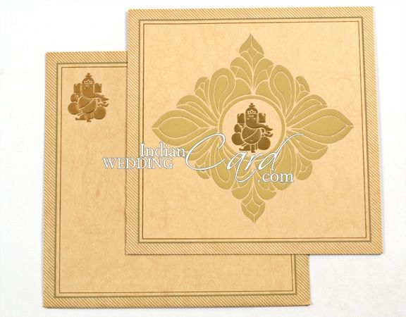 The amazing tone on tone effect comes alive in this card having a embossed design window in the center of the front with an embossed Ganeshji in gold resting in the center. There are dark brown and gold design borders coming from the bleed. The interleaf has similar design borders. Envelope too follows the same arrangement.