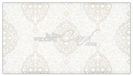 The card is designed in shape of a pocket holder. The top flap is lifted with tassel to pull out the inserts. Intricate design printed on pocket. Similar design in pearl color replicated on envelope and 2 inserts. Crystal work on front of card