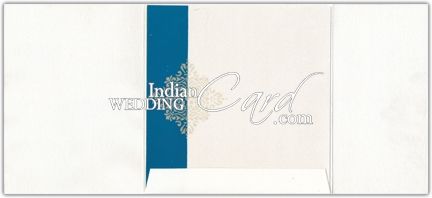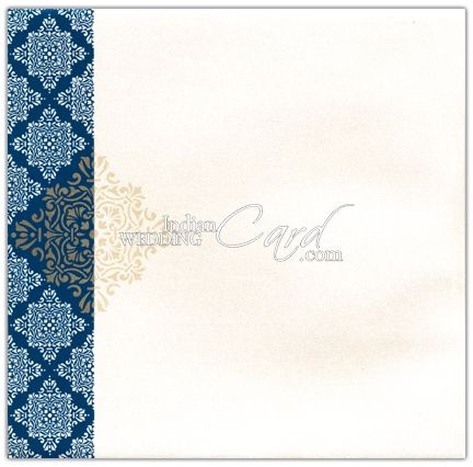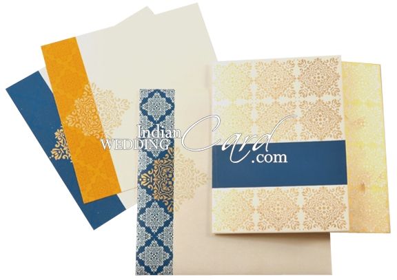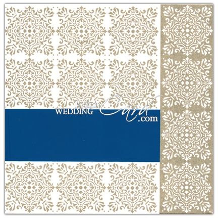 The front has purple band which can be customized with symbol or initial of your choice. The golden paisleys give card rich look. The pattern if followed on inserts and envelops.